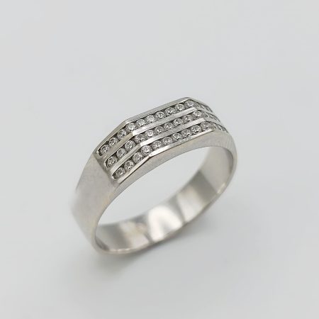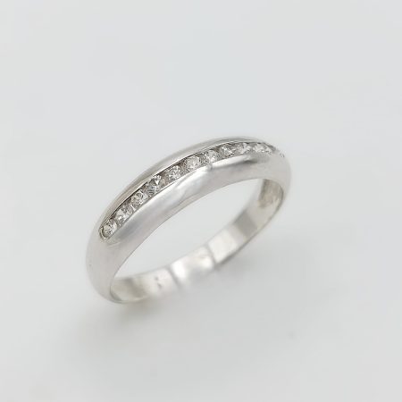 Anel em ouro branco com uma fila de zircónia embutidas no meio do anel percorrendo metade do anel. Medida: 15.