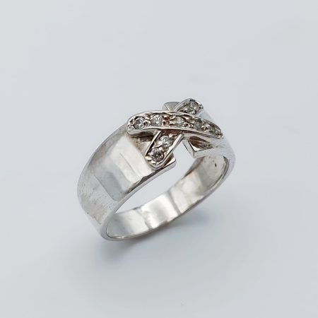 Anel em ouro branco semi aberto na parte da frente com um X em ouro branco cravado de zircónias. Medida: 14.