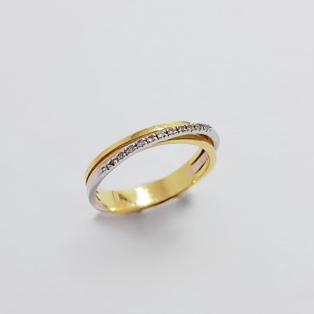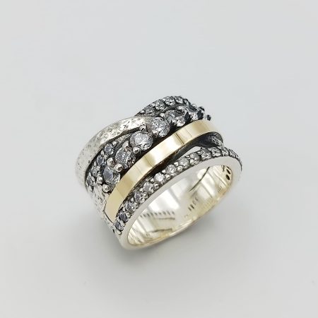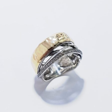 Anel em ouro e prata com uma linha mais grossa chapeada a ouro e três linhas cruzadas em que uma delas é lisa, outra é tipo torcida e outra cravejada com zircónias. Material: Ouro e prata. Peso: 13.2g. Medida: 17.