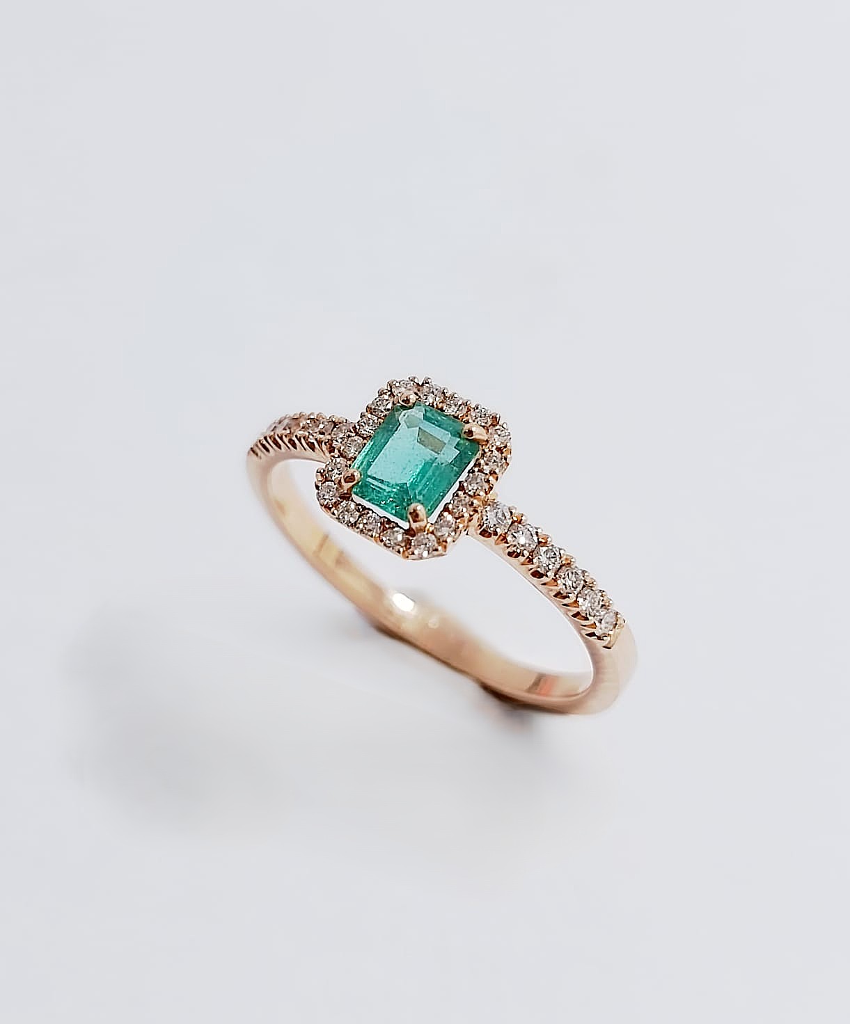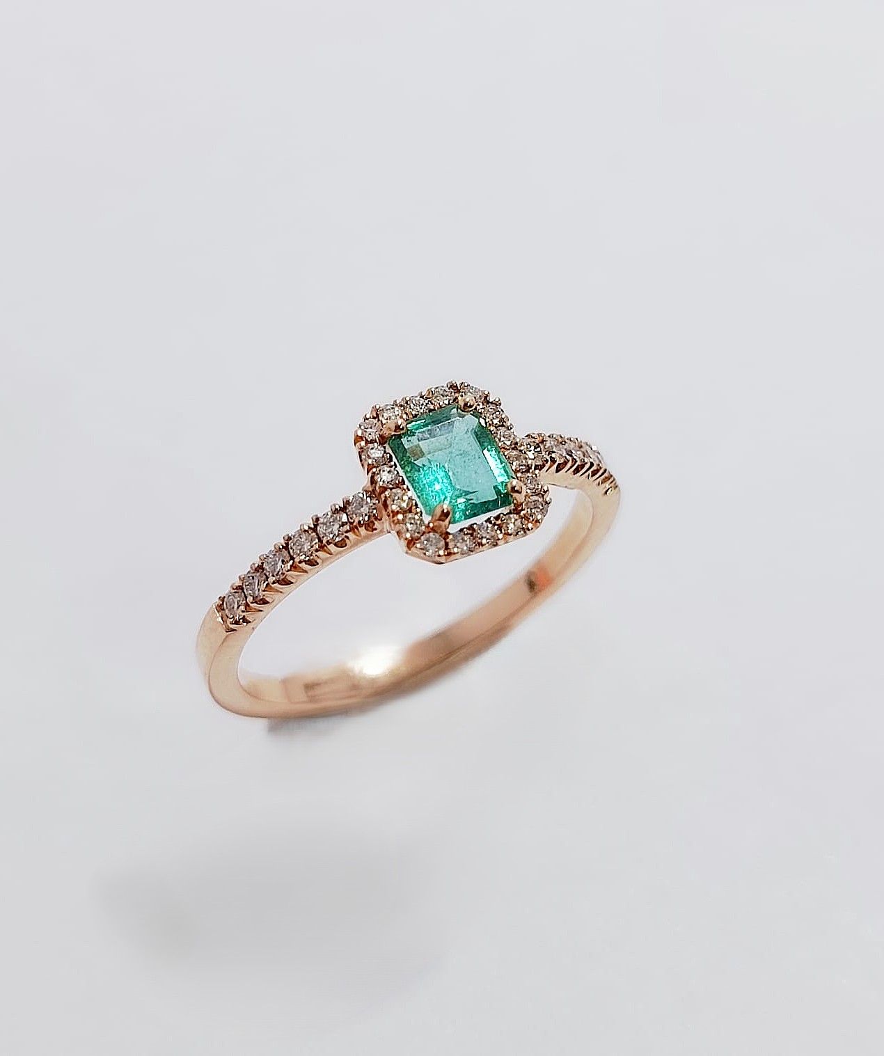 Anel em ouro rosa com uma esmeralda central envolta em diamantes e nas suas laterais conta também com uma cravação de diamantes. A jóia vai acompanhada com o respetivo certificado. Material: Ouro rosa 18k. Medida: 12.5. Pedras: Diamantes 0.20 CTS e Esmeralda 0.51 CTS. Peso: 2.37g.