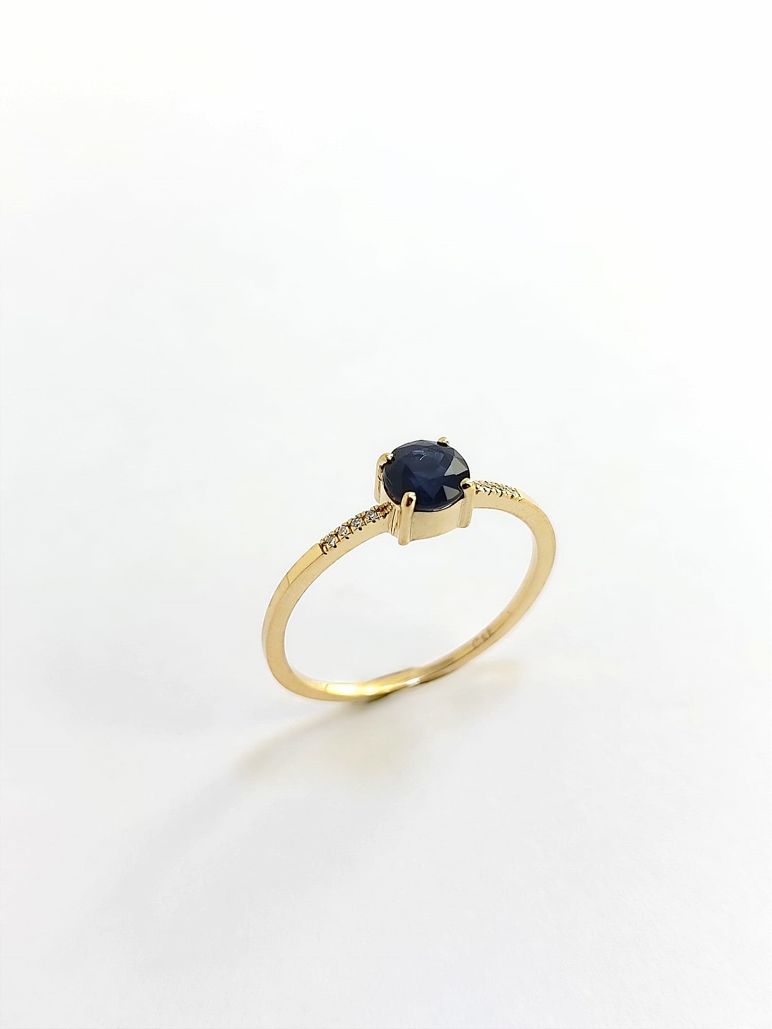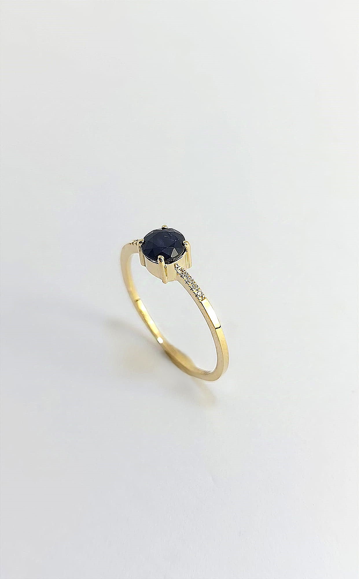 Anel do estilo solitário em ouro amarelo com uma safira azul no centro do anel e nas laterais é cravejado com diamantes. A jóia vai acompanhada do respetivo certificado. Material: Ouro amarelo 18kts. Peso: 1.5g. Medida: 14. Pedras: Safira azul e diamante 0.018 CTS.
