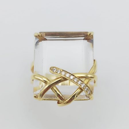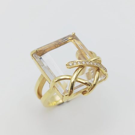 Anel Gumus Gold com cristal central retangular abraçado por fios de ouro e zircónias brancas. Materiais: Ouro Amarelo 19.2k. Pedras: Cristal, Zircónias. Peso: 11.8 gr. Tamanho da pedra: 2 cm x 1.6 cm. Tamanho: 16.
