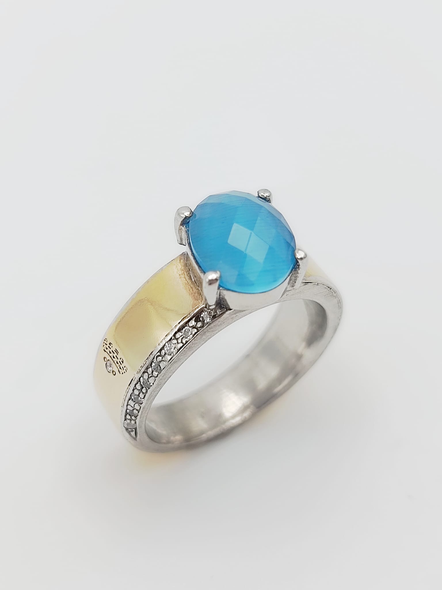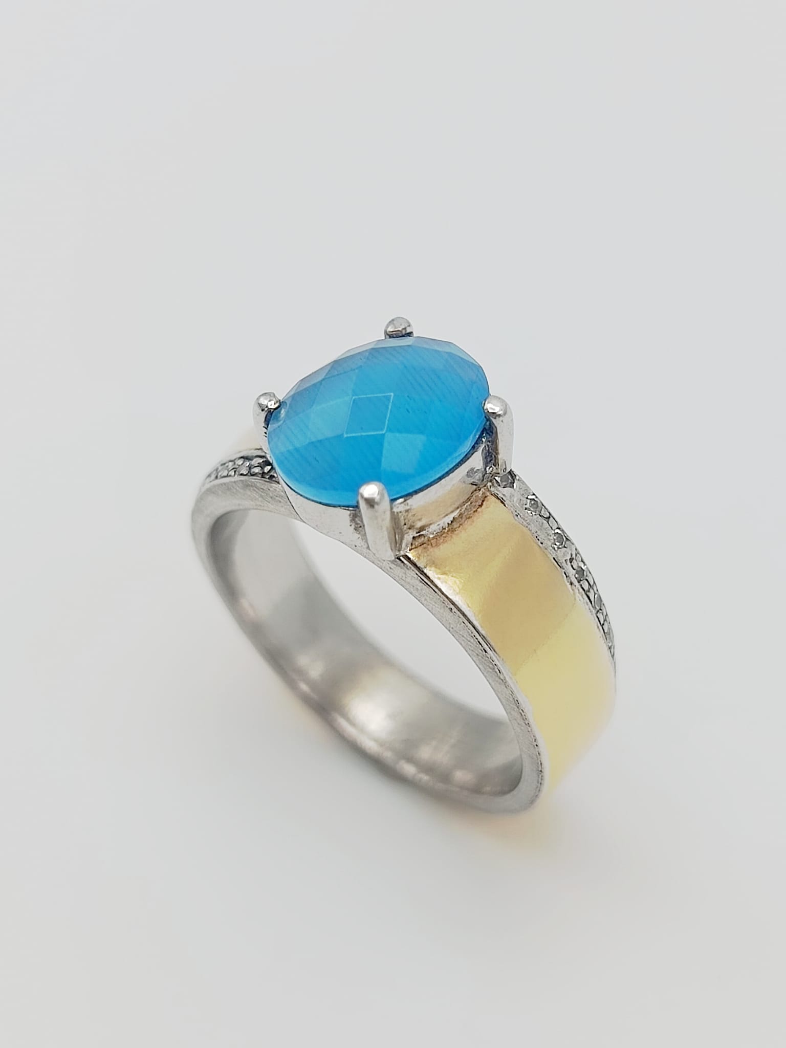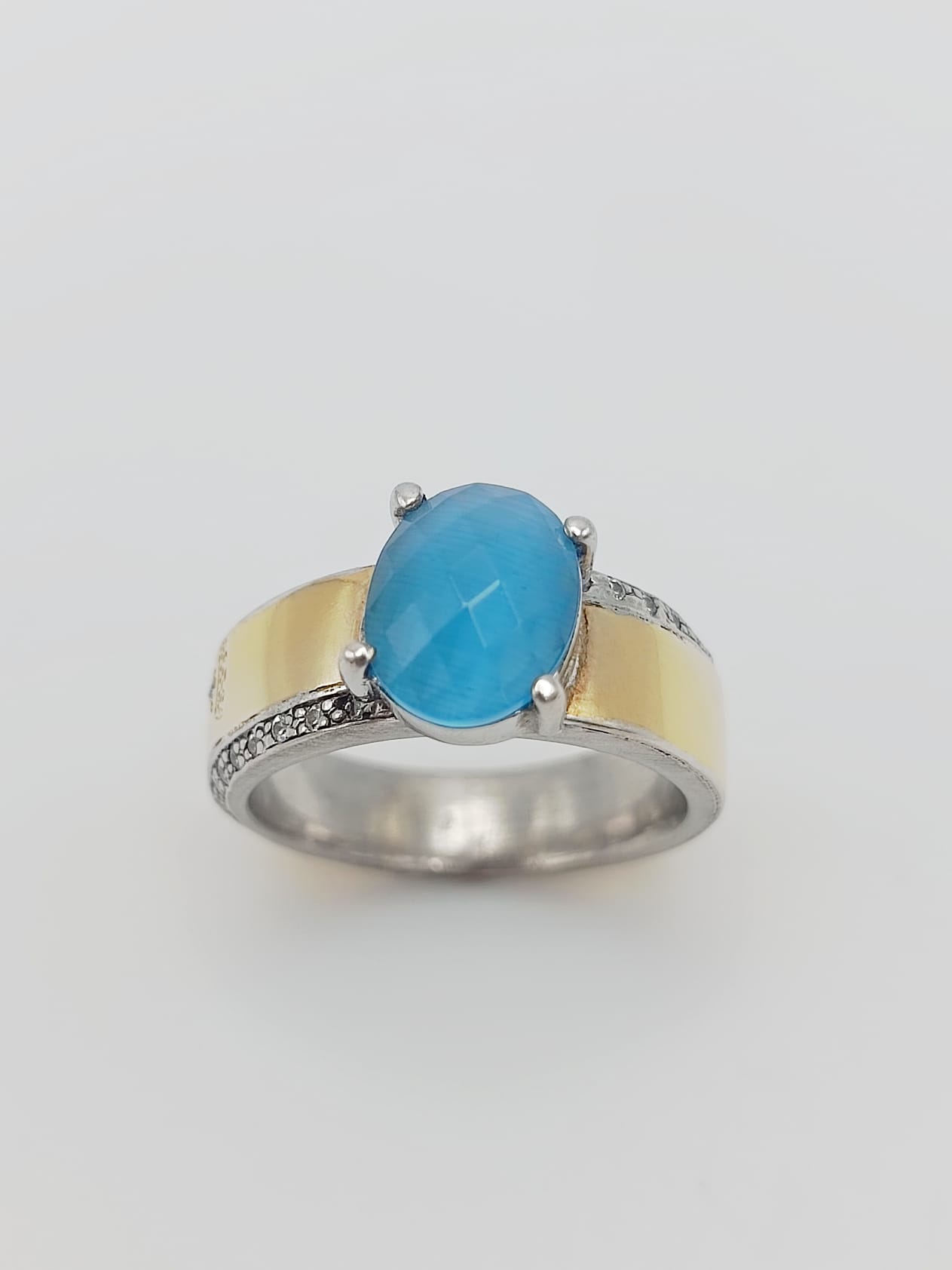 Anel em prata e ouro com pedra oval lateralizada azul e zirónias brancas. Material: Prata 925 e Ouro 9K. Tamanho 16. Largura: 0.6 cm. Peso: 8.9 gr.