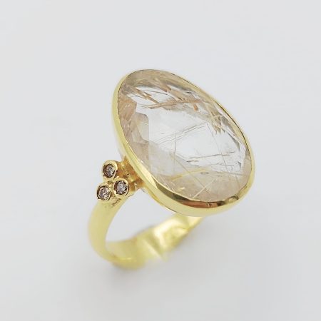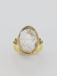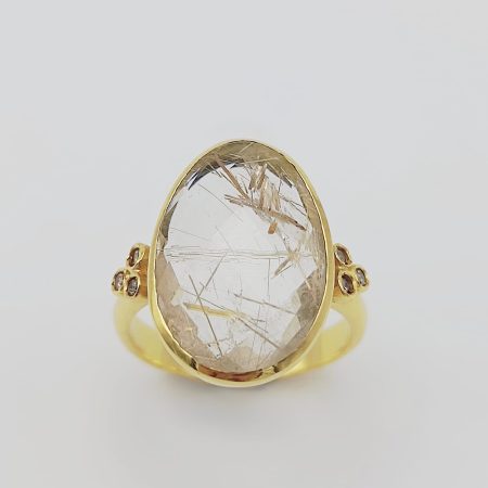 Um anel Gumus Gold com quartzo rutilado oval e três zircónias brancas em ambos os lados. Materiais: Ouro Amarelo 19.2k. Pedras: Quartzo, Zircónia. Peso: 6.9 gr. Tamanho: 17.