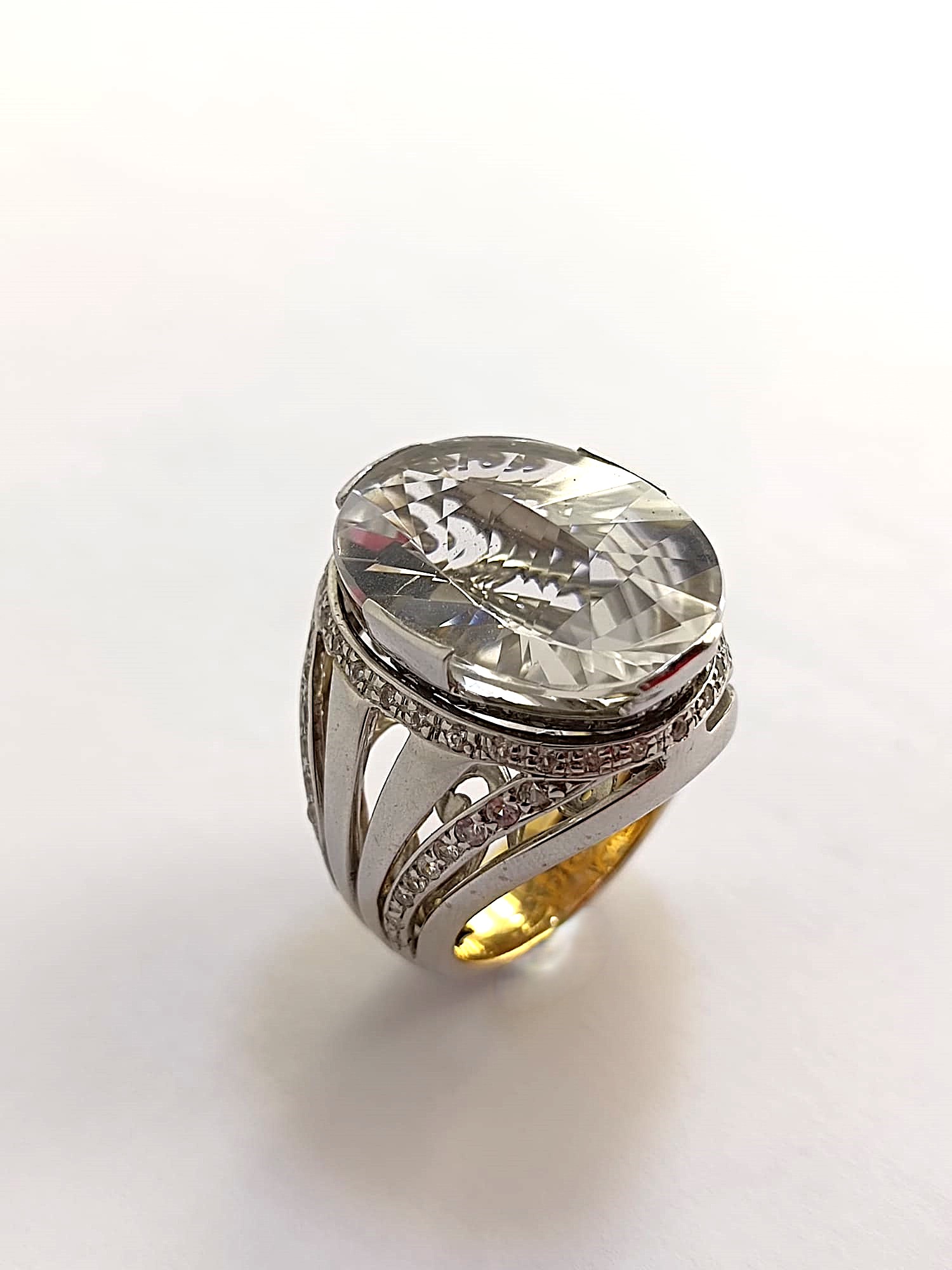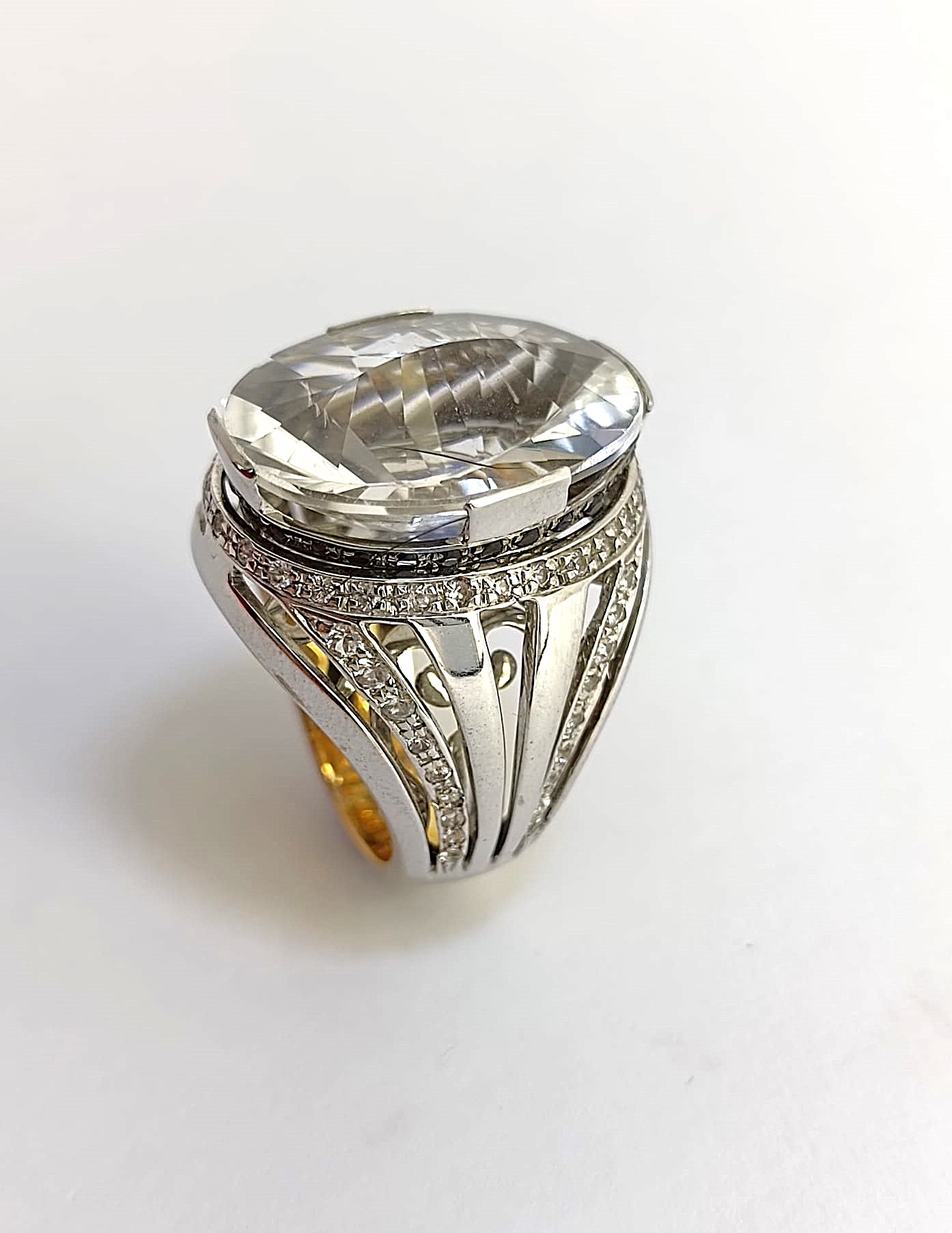 Anel em ouro branco com um cristal rocha no centro com uma dimensão de 2,3cm x 1.7cm com círculo ovalizado cravado de safiras e um trabalhado lateral em que também tem cravação de safiras. Medida: 18.
