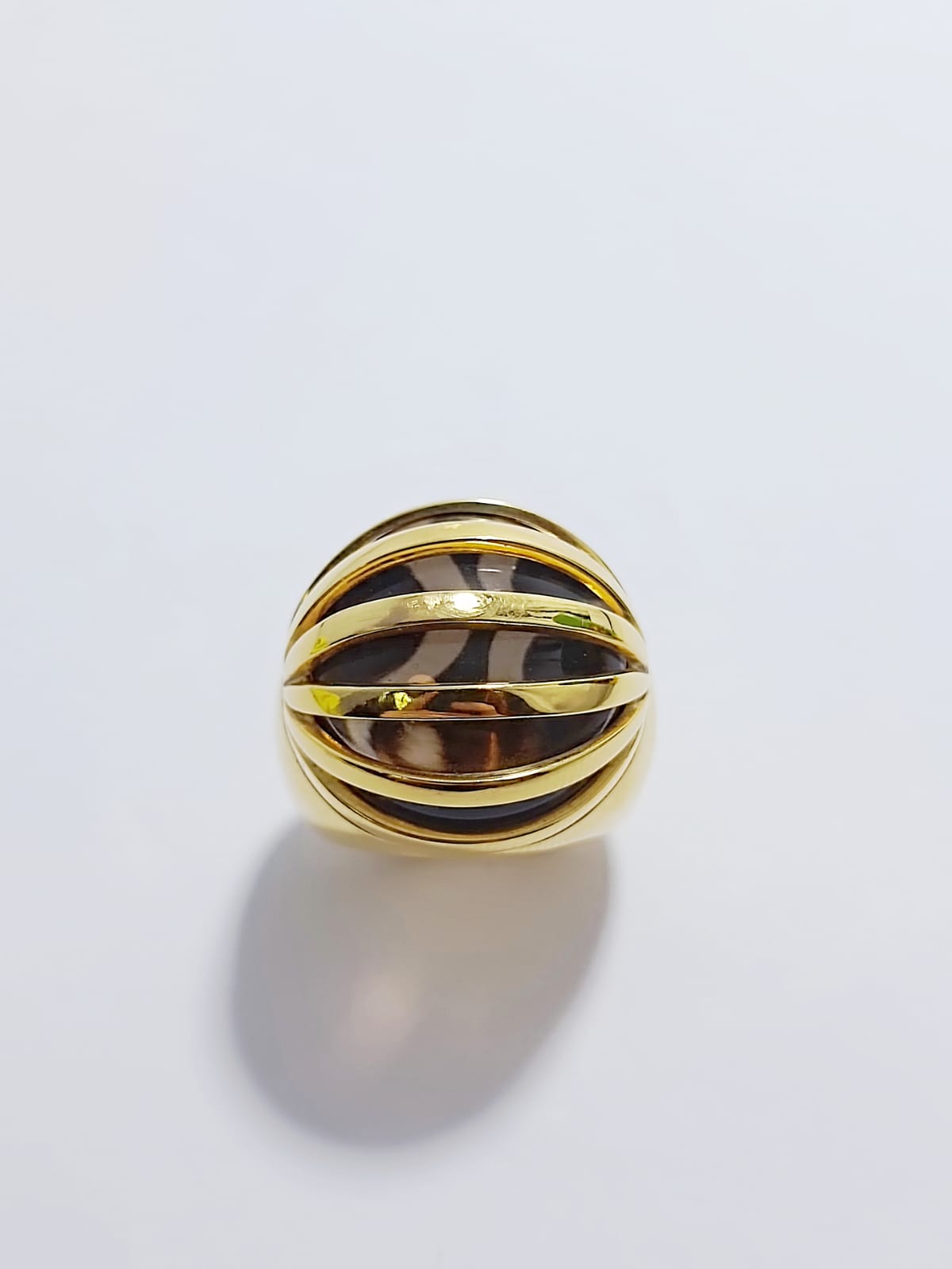 Anel em ouro composto por várias linhas de brilho champanhe e castanho. Materiais: Ouro Amarelo 19.2k. Pedras: Zircónias . Peso: 6.3 gr. Largura da banda: 0.5 cm. Tamanho: 16