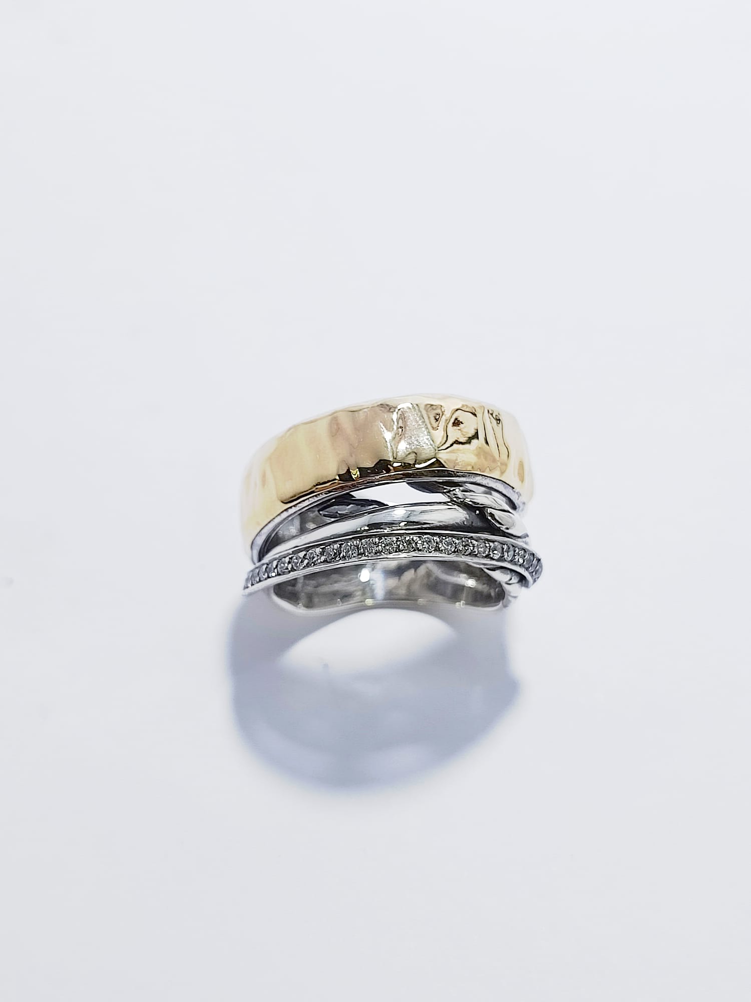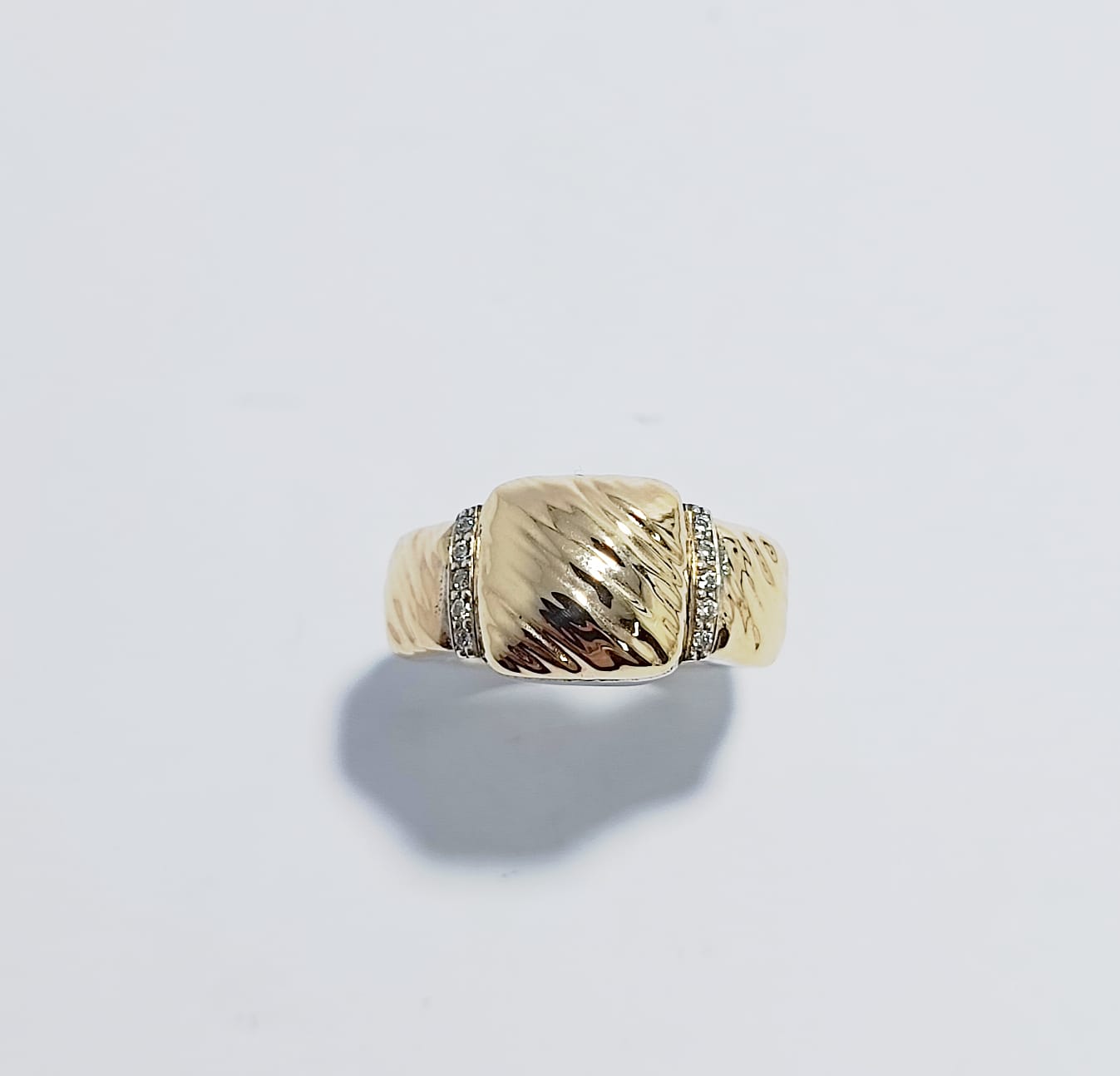 Anel em ouro composto por várias linhas de brilho champanhe e castanho. Materiais: Ouro Amarelo 19.2k. Pedras: Zircónias . Peso: 6.3 gr. Largura da banda: 0.5 cm. Tamanho: 16
